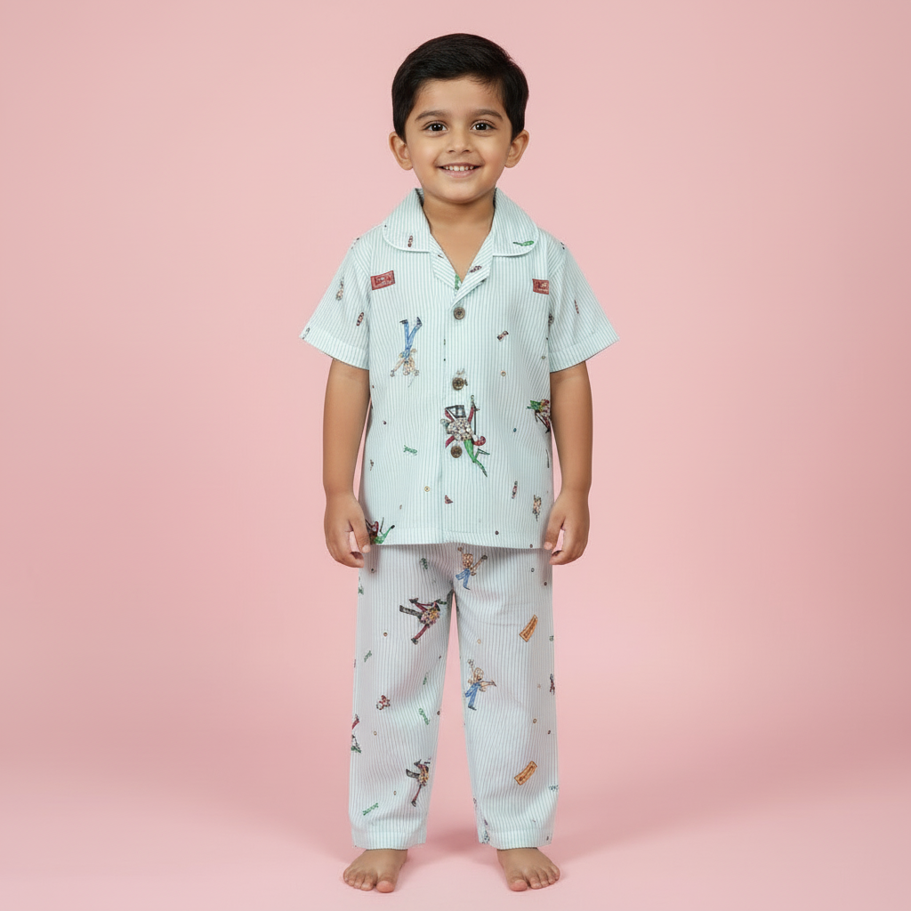 * Thick cotton fabric with white base nad blue stripes iwth Willy wonka prints